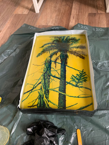 Another part of my work during the residency was the creation of two drawing-objects using resin, each measuring 30 x 20 cm. The first piece depicts a hybrid between a palm tree from the urban forest of Villa Torlonia and a coniferous tree that I had previously photographed near Popradské Pleso in the High Tatras. Although dead, this tree symbolizes new life emerging from its remains. The second piece captures the typical Roman stone pine (Pinus pinea), to which I added a Dalmatian pattern—a structure I observed on several trees in Rome. These works reflect my effort to connect different natural elements and ecosystems, emphasizing their interrelation and adaptability.